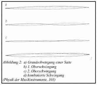 «Wird eine Saite angezupft, so beginnt sie zu schwingen. Dabei schwingt sie hauptsächlich mit ihrer Grundfrequenz. (Abbildung 2a). Dieser Grundton ist die natürlichste Art der Schwingung für jede Saite: an den Enden ist die Saite ja befestigt; dort schwingt sie also sicherlich nicht (sog. Schwingungsknoten). Je weiter man von den Enden wegkommt, desto kleiner wird der Einfluss der Befestigungspunkte auf die Schwingung, wegen der Dehnbarkeit der Saite. Daher schwingt die Saite in ihrer Mitte mit der grössten Amplitude. Allerdings ist dies nicht die einzige Schwingungsart (Mode), die von der Saite ausgeführt wird. Sie schwingt ebenfalls so wie in Abbildung 2b und Abbildu ng 2c. Diese Schwingungen heissen Oberschwingungen, die zugehörigen Töne Obertöne.